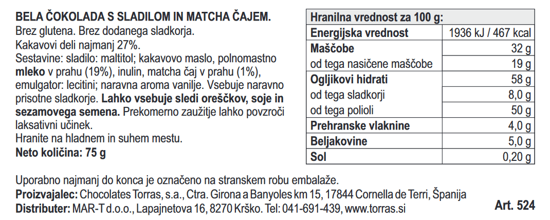 Bela čokolada s sladilom in matcha čajem, 75g količina